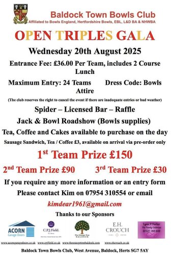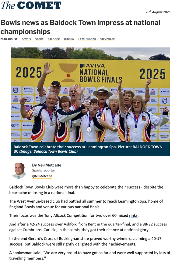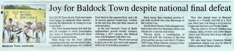 Club News - 1st December 2025We are wishing all our Club Members and Families and our Friends a Very Merry Christmas 2025! & Happy New Year 2026Club News 22nd September 2025The Last of the Letchworth & District Finals was played this week. In the Fours Final between two Baldock Teams, it came down to the last bowl. Steve Budge, Martin Roberts, Paul Andrews and Sam Andrews won by 1 shot against Dave Davis, Ian Chambers, Brian Todd and Mike Parsons.We were Runners-up in the Stevenage & District Mixed Bowls League for 2025, That’s it for this season. BTClub News 15th September 2025We had a very busy weekend. In the final stages of The County League we beat Garston by 8 shots in the semi final. In a very tense final we lost by 2 shots against Buntingford. In the Letchworth and District Finals we were very well represented. In the singles final Paul Andrews beat his son Sam. The pairs final was also an all Baldock affair with Lorcan Saunders and Darren Hickin beating Steve Budge and Aaron Heath on an extra end. The Triples Final saw Harry Undrell, Martin Roberts and Hayden Chambers beating a team from Royston. The Fours final was postponed due to a flooded green. In a friendly game we beat Henlow 81-77. BTClub News 9th September 2025In our Club Finals weekend here are our winners - Ladies Champion Megan Mackinnon, Men’s Champion Martin Roberts, Open Sets John Graham, Men’s Handicap Sam Andrews, Ladies Handicap Sarah Berry, Fixed Jack-Wendy Budge, Graded Pairs - Matt Hayzelden and Hayden Chambers, Open Pairs - Ian Chambers and Sam Andrews, Challenge Shield - Matt Undrell, Men’s Two Bowl - Sam Andrews, Ladies Two Bowl- Julie Undrell, and Open Triples - Julie Mutter, Sofie Harrington(reserve), Matt Hayzelden and Harry Undrell. Elsewhere In friendlies we beat Letchworth 98-35 and a touring team from Gravesend 126-48. BTClub News 1st September 2025The Hertfordshire County North Area League Finals took place at Baldock this weekend.In the Semi Final our Team beat St.Ippolyts 52-15 and in the Final we beat Stevenage 36-24. We will now play the County Finals at Garston later this month.In the Stevenage Mixed League in our final game, we beat Howard Garden 55-47 gaining 4 points to 2.Although we currently retain our top position there are teams with games in hand that can catch us. BTHertfordshire County North Area League Champions 2025Right to Left: Darren Hickin, Sam Andrews, Matt Hayzelden, Aaron Heath, Hayden Chambers, Jamie Claydon, Lorcan Saunders, Steve Budge.Club News - 25th August 2025In the North Herts Ladies Finals we lost the Challenge Shield to Stevenage 1-3 with Ness Graham winning the Singles. In the Triples Competition Wendy Budge, Mary Ann Haskins and Kim Dear won the Triples against Letchworth. On Wednesday we had our first Gala for over 25 years. It was a huge success with 24 teams taking part. The winners were a rink from Stevenage. We won the Cairns Cup against Royston 63-51. We have now won it for the last three years. In the Stevenage Mixed league we beat Royston 36-35 and Howard Garden 75-30 gaining 11 points out of 12. In a friendly game we beat Buntingford 70-36.Letchworth & District Cairns Cup Winners 2025Back Row: Lorcan Saunders, Matt Hayzelden, Jamie Claydon, Paul Andrews, Steve Budge, Aaron Heath. Front Row: Sam Andrews, Harry Undrell.Club News - 21st August 2025The National Bowls Championships are currently being held at Leamington Spa. In the Tony Allcock Competition (two over 60 mixed rinks) we beat Ashford in Kent 42-24 in the Quarter Final. The semi-final saw us beat Carlisle in Cumbria 38-32. In the National Final we were beaten 17-40 by an excellent side from Gerard’s Cross. We are very proud to have got so far and were well supported by lots of travelling members. In the Cairns Cup semi final we beat Stevenage 80-49. BTFront Row - Paul Haskings, Kim Dear, Carol Pomfrey, Janet Turner, Ness Graham.Back Row - Brian Todd, Terry Godden, Mike Parsons, Rose Castle.National Bowls Finals 2025 - Tony Allcock Trophy Runners-up