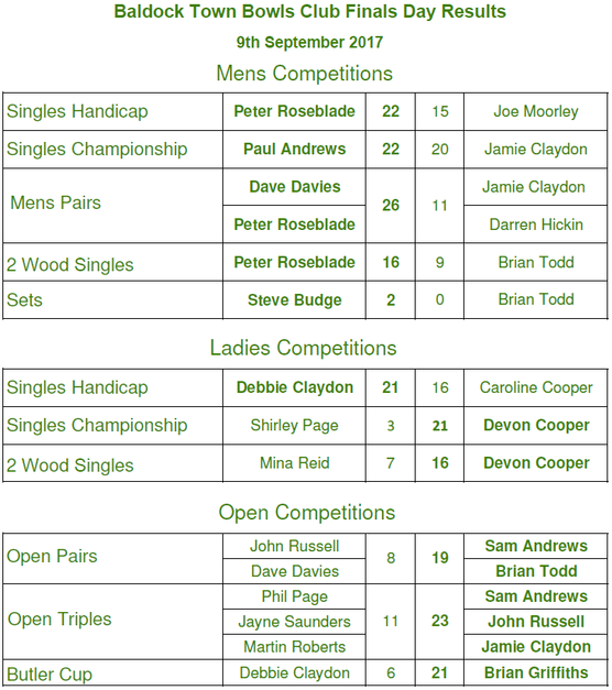 The ladies held the North Herts finals and Baldock had success in the triples with Devon Cooper, Rose Castle and Shirley Page.